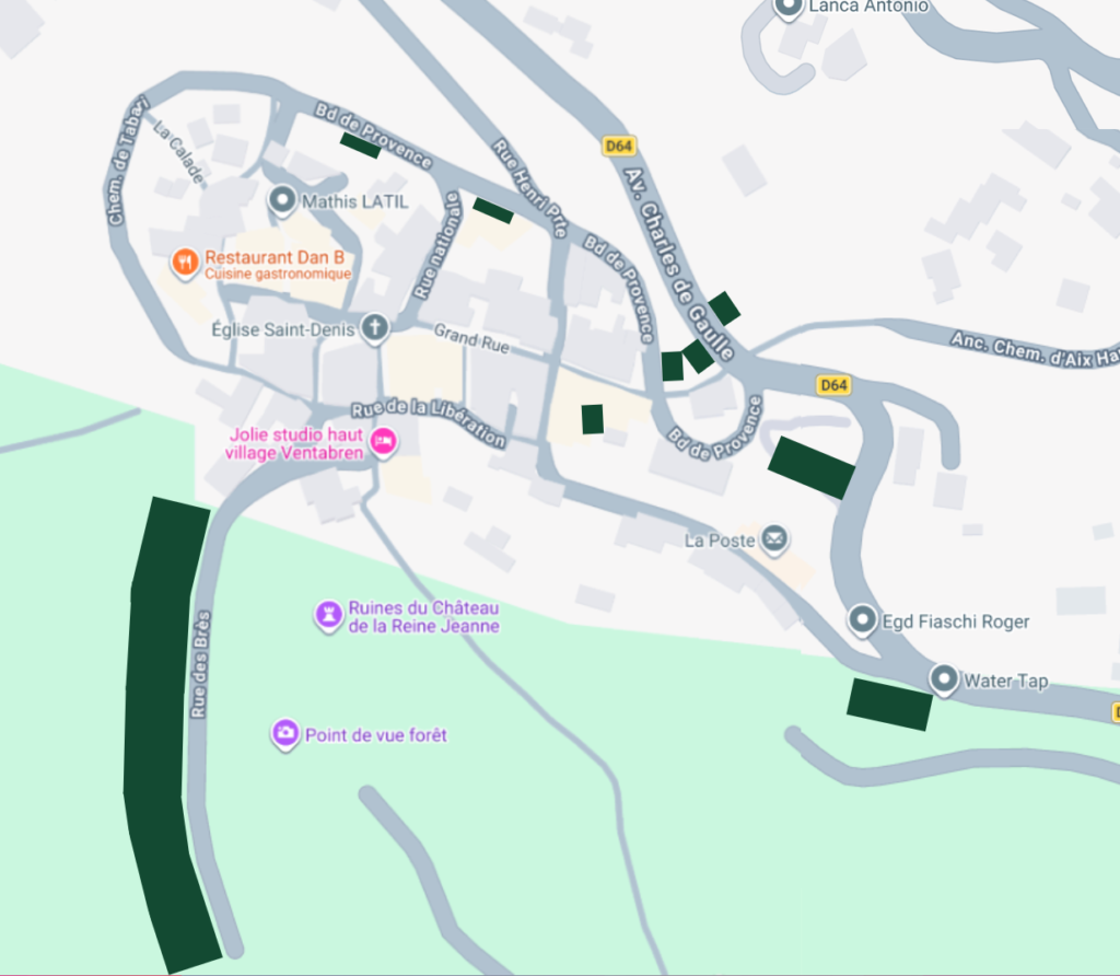 Les zones vertes foncées sur la carte représentent les zones de parking.